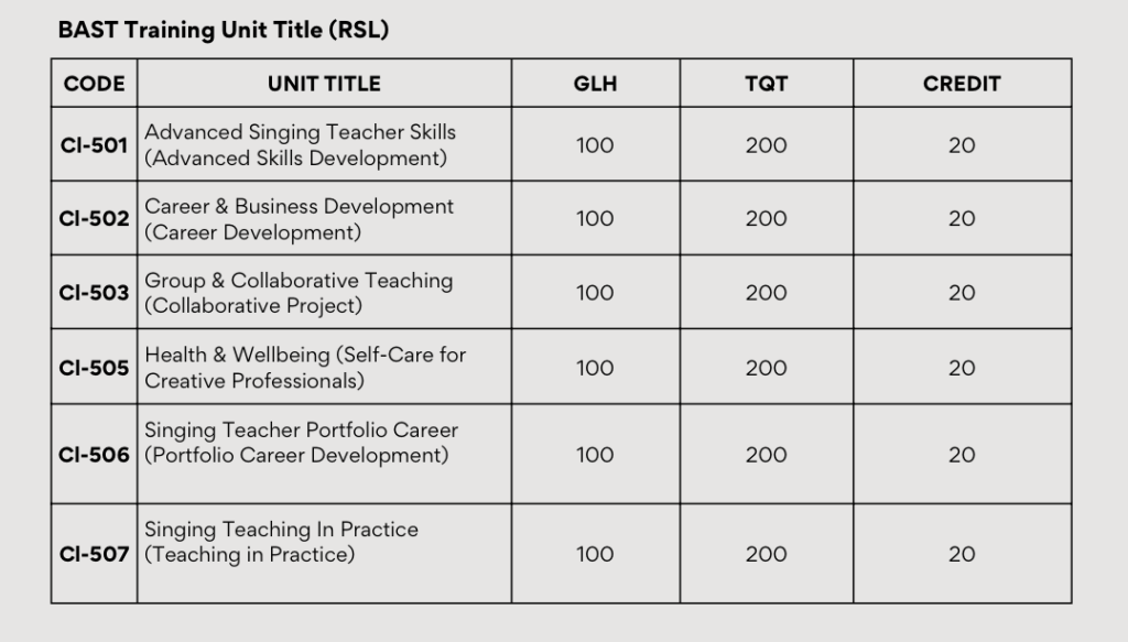 The Level 5 Extended Diploma awards the learner 120 Credits and the Diploma awards 80 credits. The final qualification will be awarded to the singing teacher upon successful completion of a specified number of Guided Learning Hours (GLH). A Level 5 qualification is equivalent in standard to the second year of a university degree.